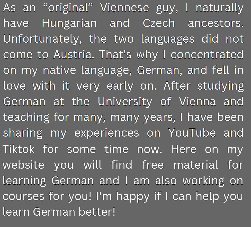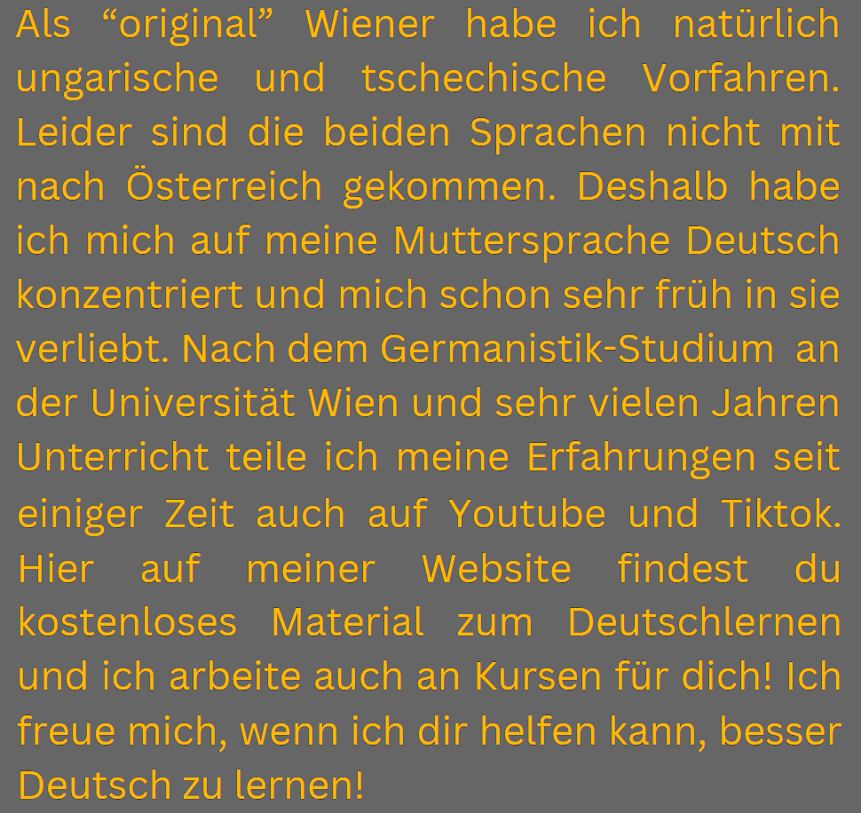 Wenn du mehr Tipps, Tricks, Erklärungen und Übungen von mir möchtest, freue ich mich, wenn du meine Kanäle auf Youtube und Tiktok abonnierst. Es gibt jede Woche Neuigkeiten über die deutsche Sprache und wie du sie am besten lernen kannst!