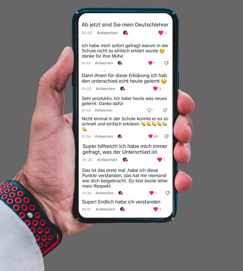 Ich freue mich sehr, wenn meine Videos dir beim Erlernen der deutschen Sprache helfen. Es ist wunderbar, diese positiven Kommentare zu sehen! Hier sind einige davon, die mir wirklich ein Lächeln ins Gesicht zaubern.